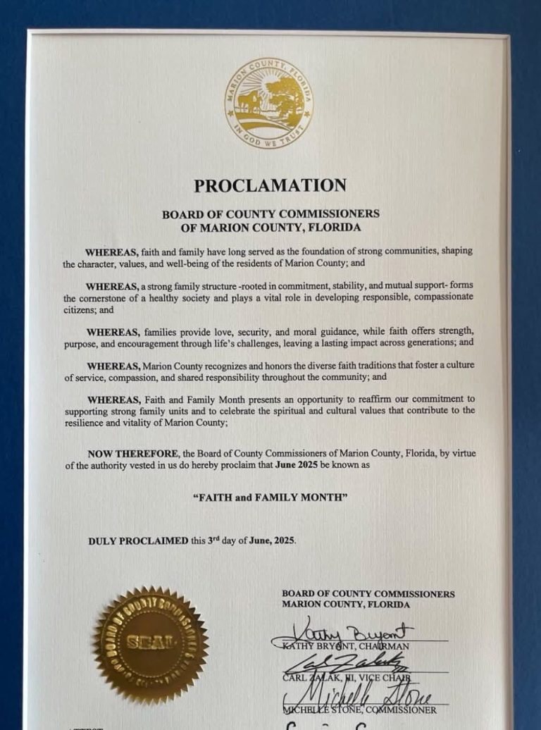 The Mayor of Ocala gave a proclamation for Faith and Family month June 17th 2025